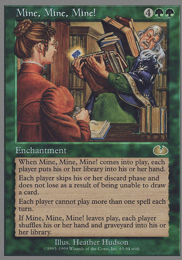 haben sogar die Fähigkeit, dass der Friedhof in die Bibliothek gemischt wird, wenn diese Karten in den Friedhof gelegt werden. Einige andere haben ähnliche Fähigkeiten, jedoch nur, wenn sie aus dem Spiel in den Friedhof gelangen, und häufig auf Kreaturen beschränkt. Diese drei Karten haben heute einen Wert ab 25 beziehungsweise 50$. Die Spassedition Unglued hatte eine Karte namens Mine, Mine, Mine!, die verhinderte, dass man verlor, wenn man keine karte ziehen kann. Da es sich um eine Spassedition handelt, sind diese Karten aber nicht legal, also kann man sie nur nach Absprache spielen.